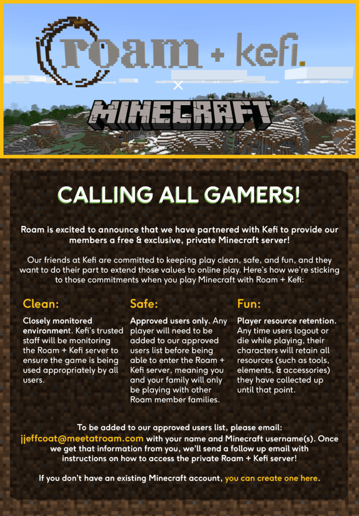 We’ve got something very exciting for you and your family this week! We’ve teamed up with our friends at Kefi to create a Minecraft server reserved specifically for you and your kids! To keep things clean, fun and safe for your family, all participants must be approved to play on this network. To learn more, take a look at the graphic below to see how you can start playing.